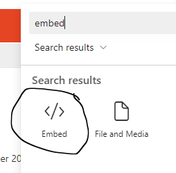 Embed by adding the embed web part. Search on the word “embed,” and choose it. To embed, type as follows in the web part properties. You may have to adjust width and height to suit your needs. These settings work well for my desktop (1920 x 1080). Note that this is not a “responsive” solution. People using various [smaller] devices might not be able to see that calendar very well.